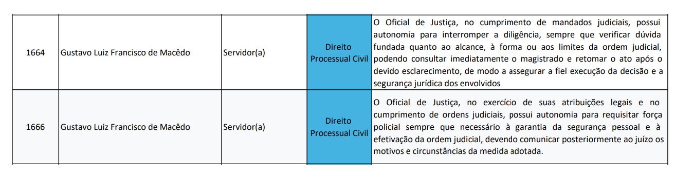 Ao todo, a primeira edição do Congresso reuniu 291 propostas enviadas por magistrados, servidores e oficiais de Justiça de todo o país. Entre os participantes, Gustavo Macêdo se destaca como o único Oficial de Justiça com enunciados admitidos, o que reforça a relevância de sua contribuição técnica e prática para o aprimoramento da Justiça brasileira.